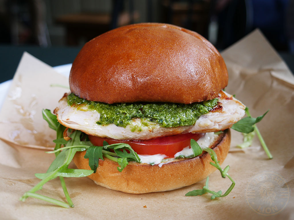 Pesto – Free-range grilled chicken breast, basil pesto, mustard mayo, tomato & rocket, £12.50 inc. a side