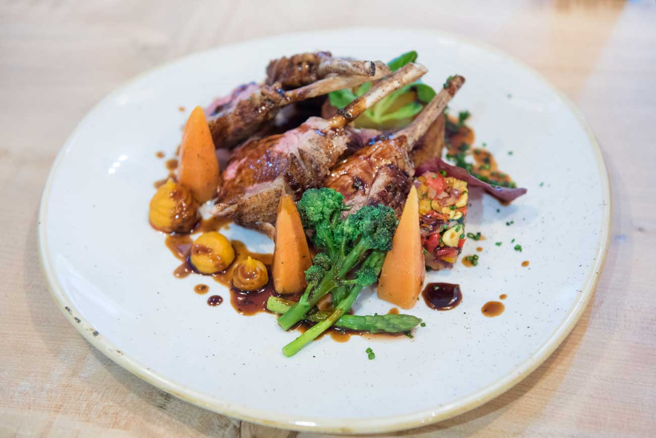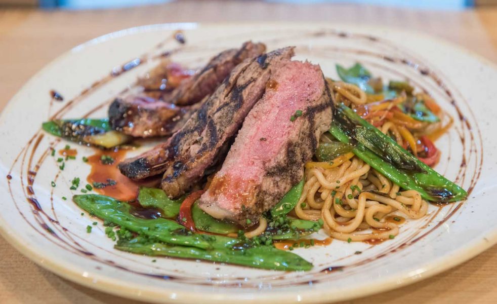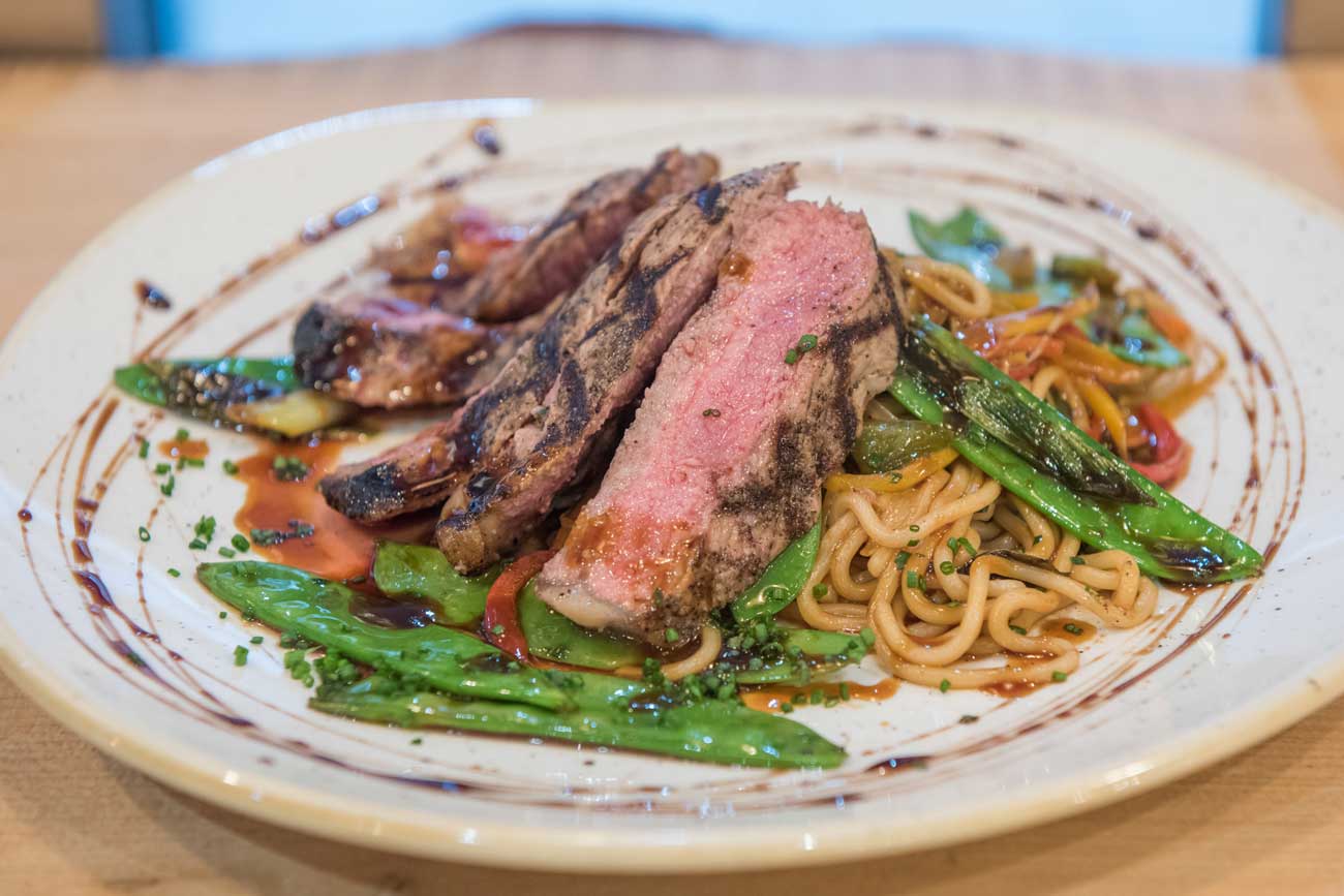 - Golden glazed teriyaki salmon fillet, stir fry noodles, hok choi and julienne vegetables, garnished with micro cress, £18.95