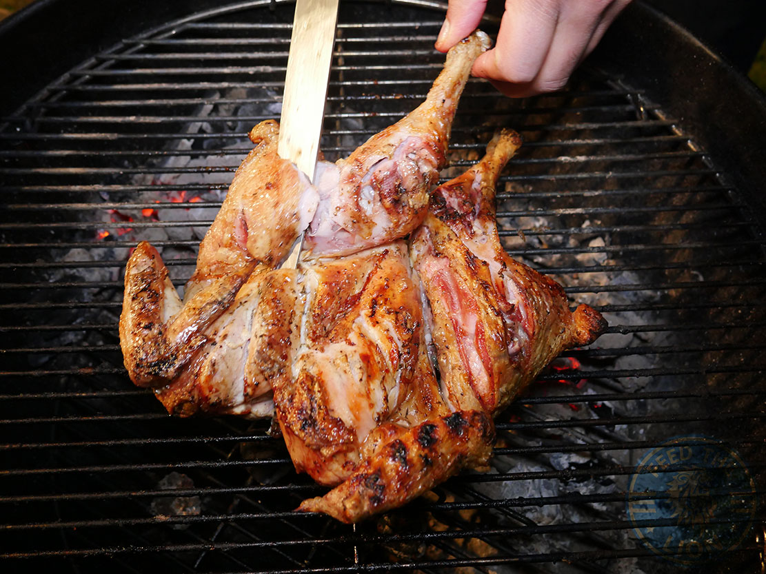 This particular one is known as a Spatchcock Chicken which “involves carefully cutting the backbone in order to flatten the chicken out before cooking”, and is “by the far the fastest way of roasting or grilling a whole chicken”.