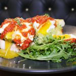 Eggs & Avocado – Smashed avocado with halloumi sticks on sourdough bread with a poached egg, portabella mushroom. served with a spicy cherry tomato sauce, £7.95