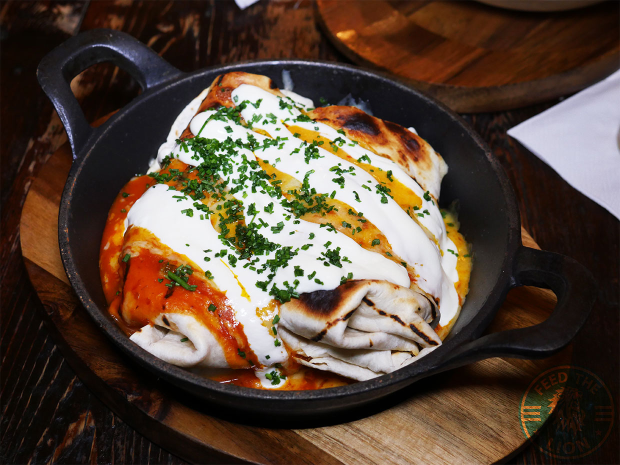 Chicken Enchiladas – SautĂ©d chicken, black beans, Monterey Jack cheese with spiced tomato sauce wrapped in a grilled tortilla with Mexicana cheese & sour cream, ÂŁ11.50