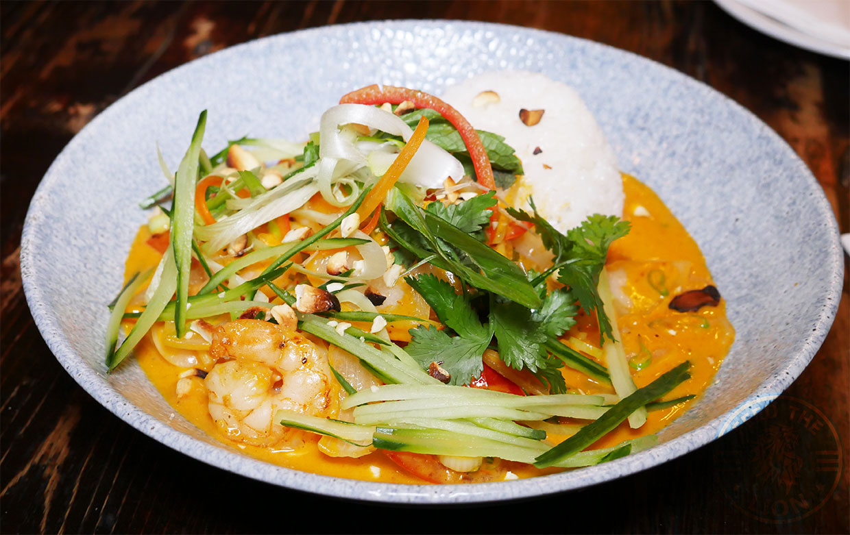 Thai Red Curry (Shrimp) – Chicken, shrimp or vegetables in Thai red curry sauce, with cashews & your choice of jasmine rice or egg noodles, ÂŁ16.00
