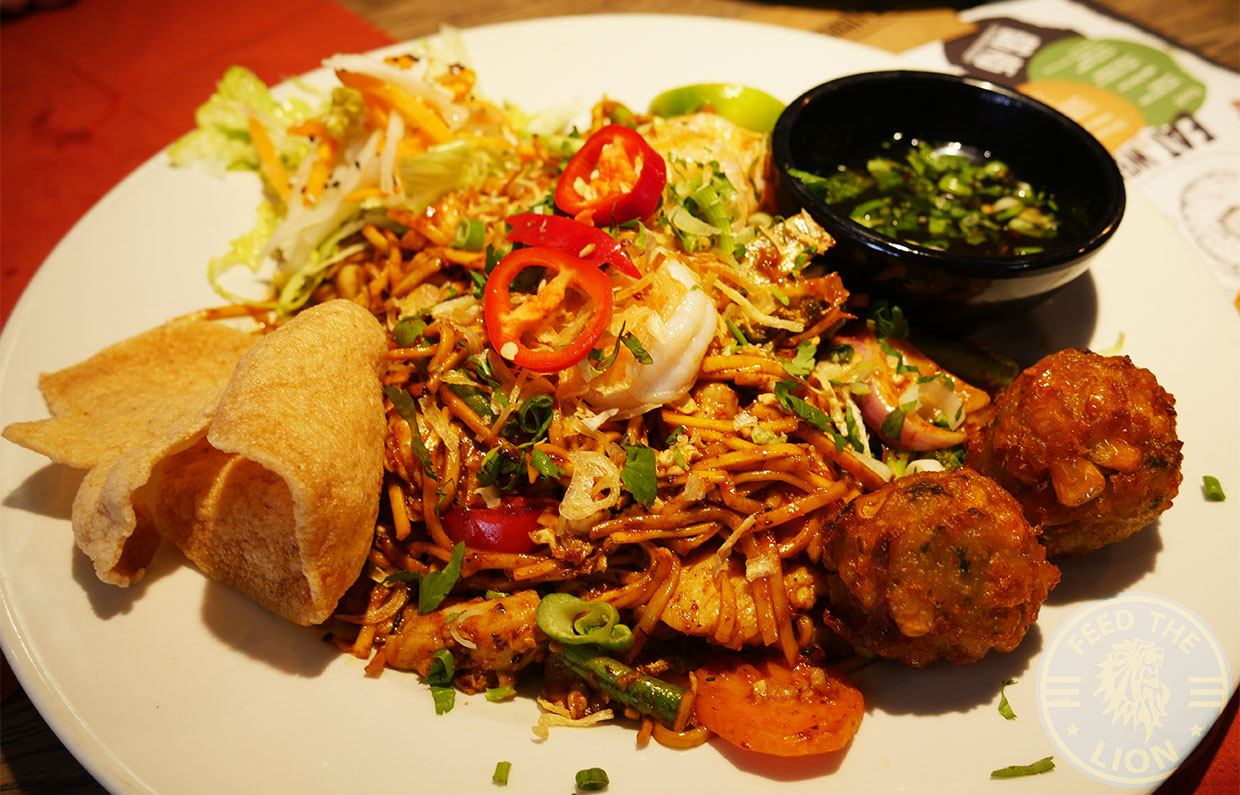 Banana Tree Spiced Noodles – Vegetables, prawns, chicken, eggs & wheat noodles all wok tossed with our special spiced paste. Served with sweet corn cakes, Indo Cracker, Viet pickle & Nuoc Cham sauce to pour over, £11.95