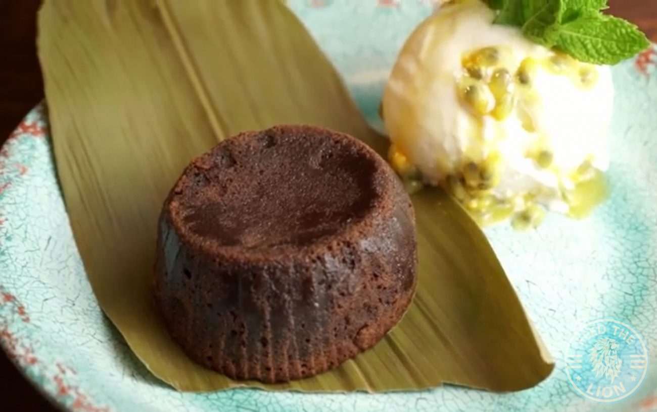 Warm Chocolate Indo-Fondant – chocolate centred fondant served with coconut ice cream and fresh passion fruit, £6.35