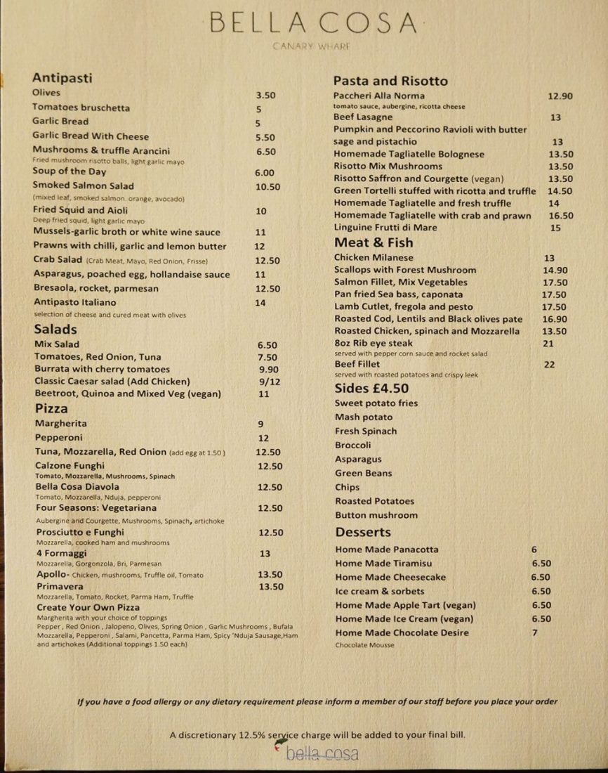 Please also note that Bella Cosa will add on a 12.5% discretionary service charge to your final bill.