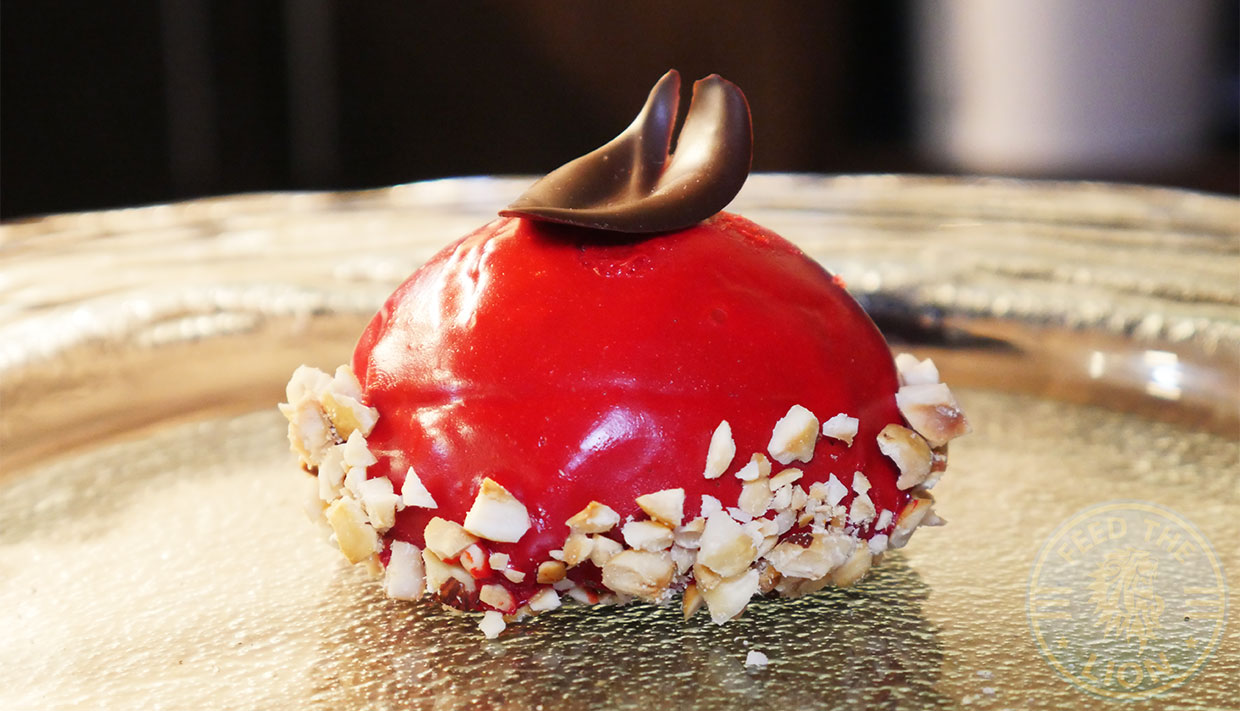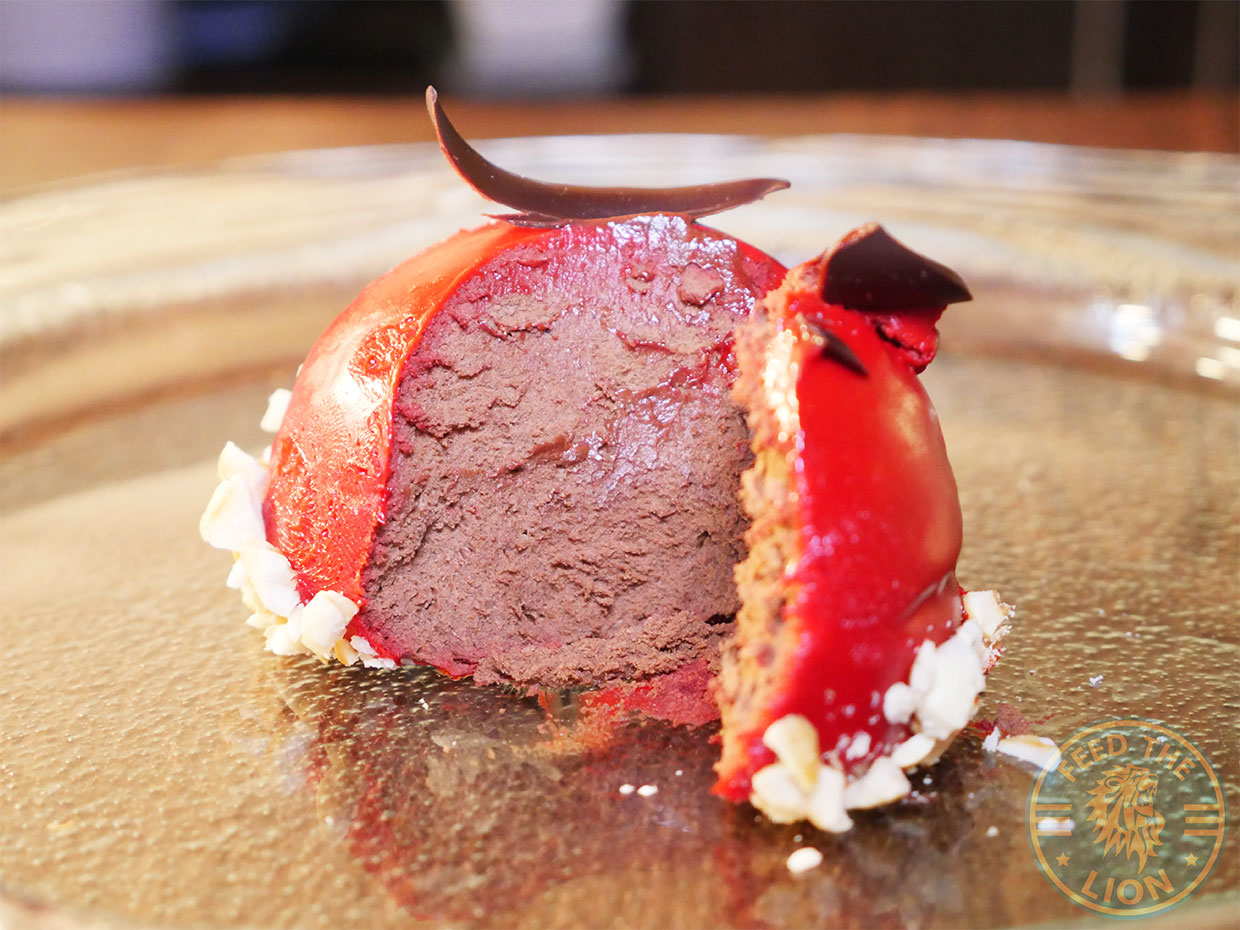 Encased in a red coating of something which didn’t taste of very much was this milk chocolatey mousse, which had enough firmness to ensure prolonged pleasure.