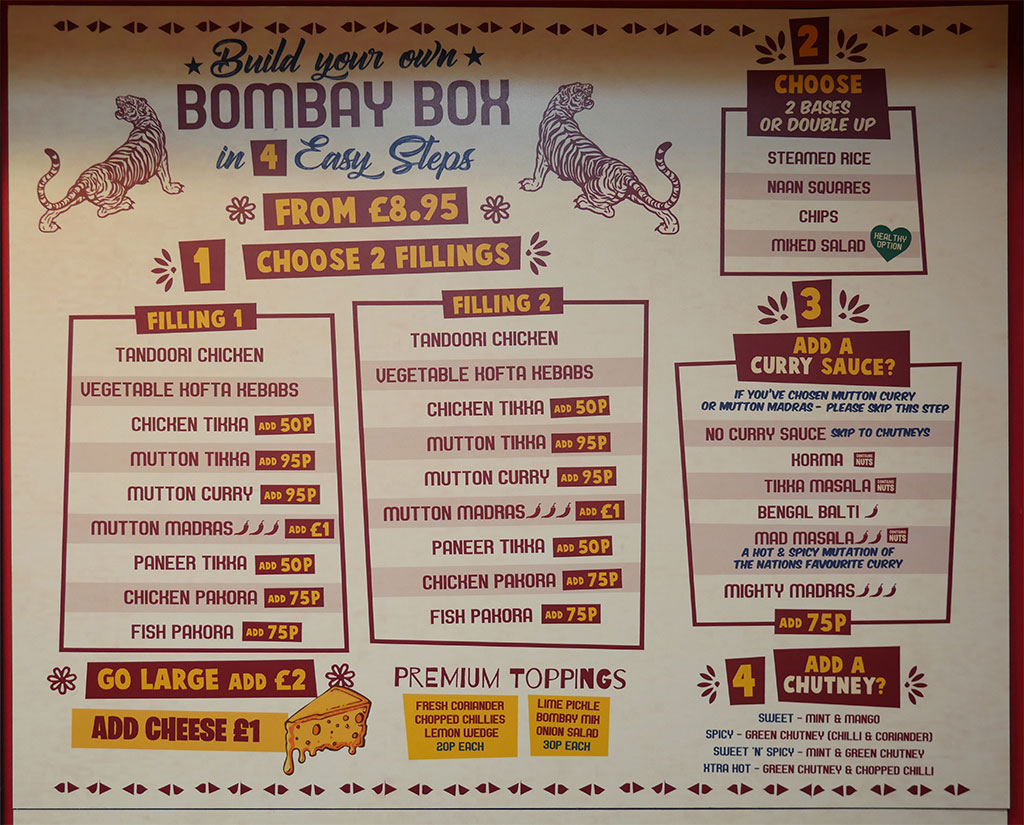 But it’s their 4-step build-your-own-box option that will entice customers to return time and time again, with the choice of two fillings out of a staggering 18 options, a base from a choice of four, and a curry sauce and a chutney to finish the process.