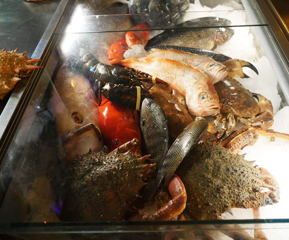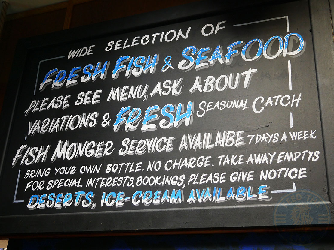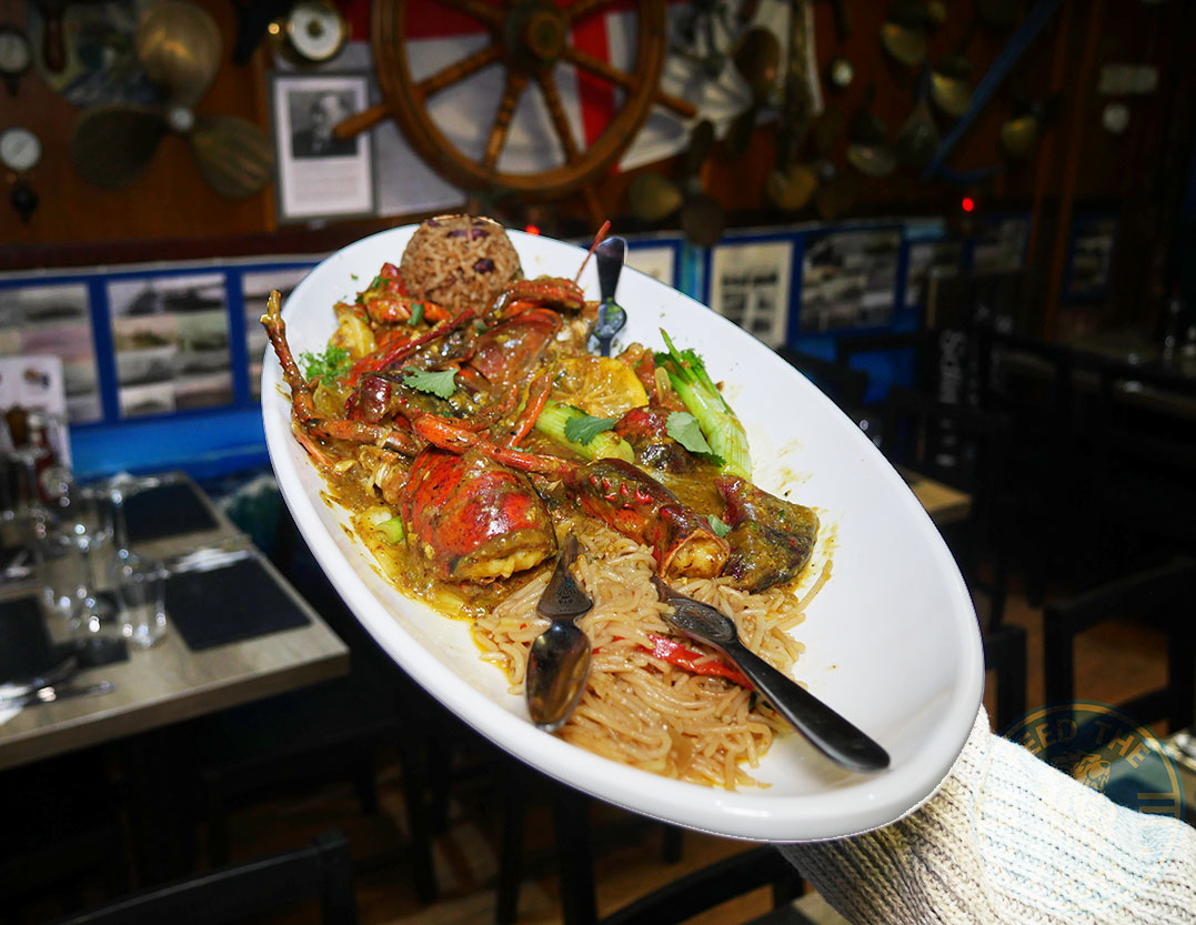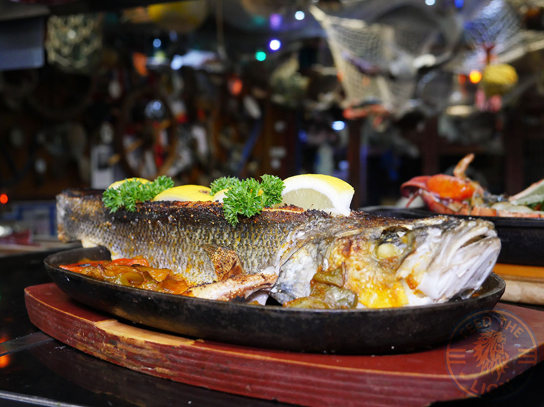 As decor, you won’t fail to miss the wall-mounted 8-spoke Whitby ship’s wheel; or the boat propellers and the maritime clocks. And what to say of the overhanging fish nets filled with lobsters and other plastic models; or the giant green glass balls suspended from ropes; or the flickering lanterns hanging overhead?