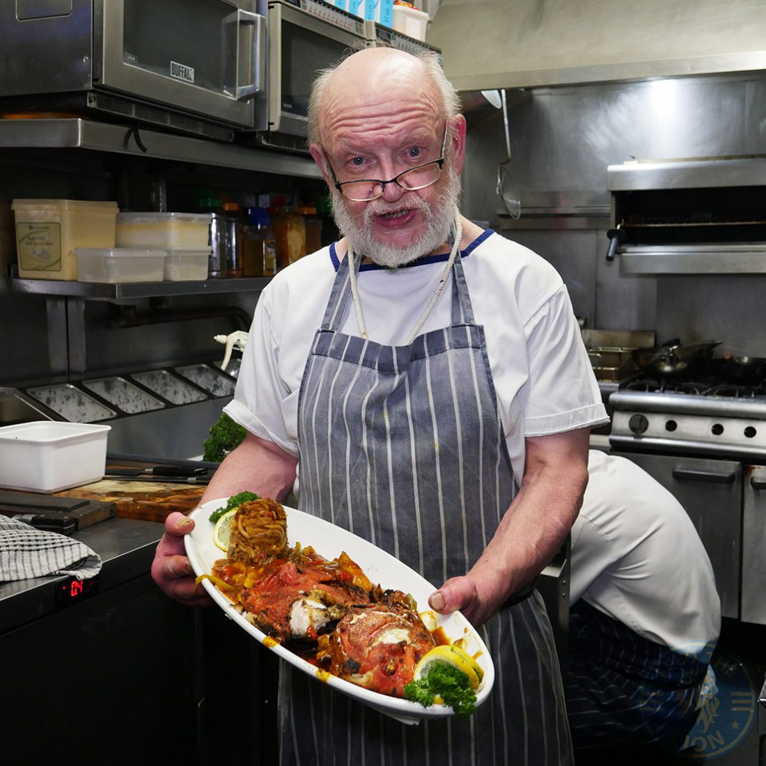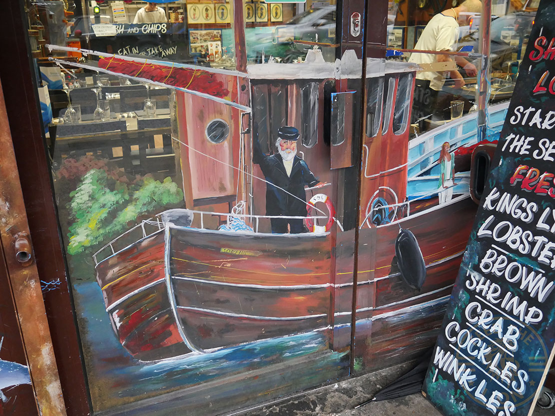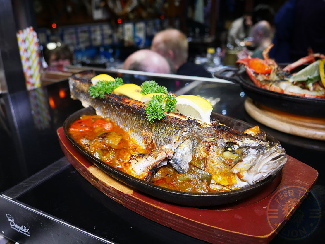 As decor, you won’t fail to miss the wall-mounted 8-spoke Whitby ship’s wheel; or the boat propellers and the maritime clocks. And what to say of the overhanging fish nets filled with lobsters and other plastic models; or the giant green glass balls suspended from ropes; or the flickering lanterns hanging overhead?