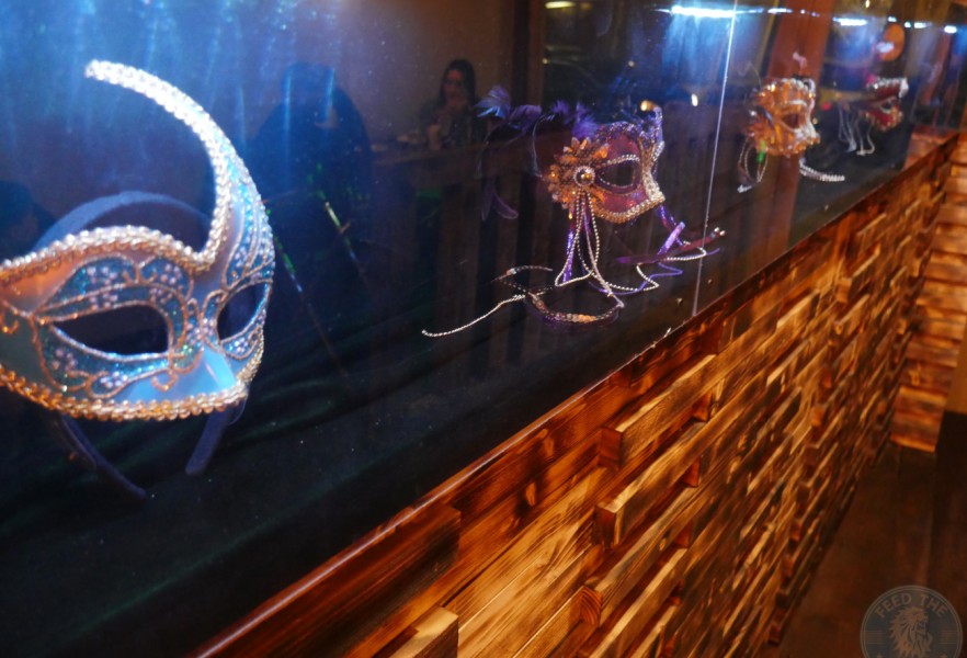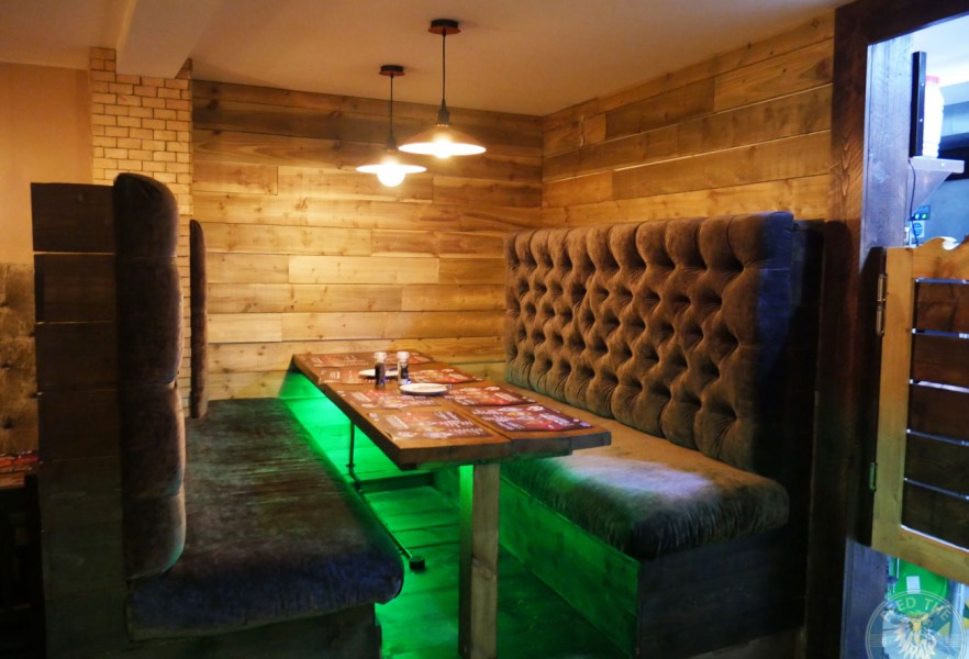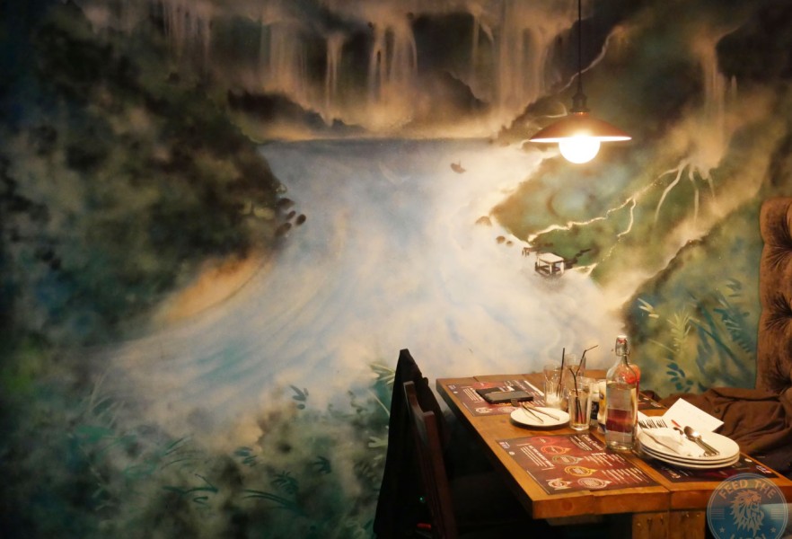 While wood largely makes up for the interior design, including patterned wall panels, dining tables, and these cool saloon-style swinging doors that lead into the basement kitchen, you’ll also find grey suede cushioned-seating downstairs which, though comfortable, doesn’t entirely go with the overall wooden theme, as well as a large eye-catching wall mural of South America’s famous Iguazu Falls that forms the boundary between Argentina and Brazil.