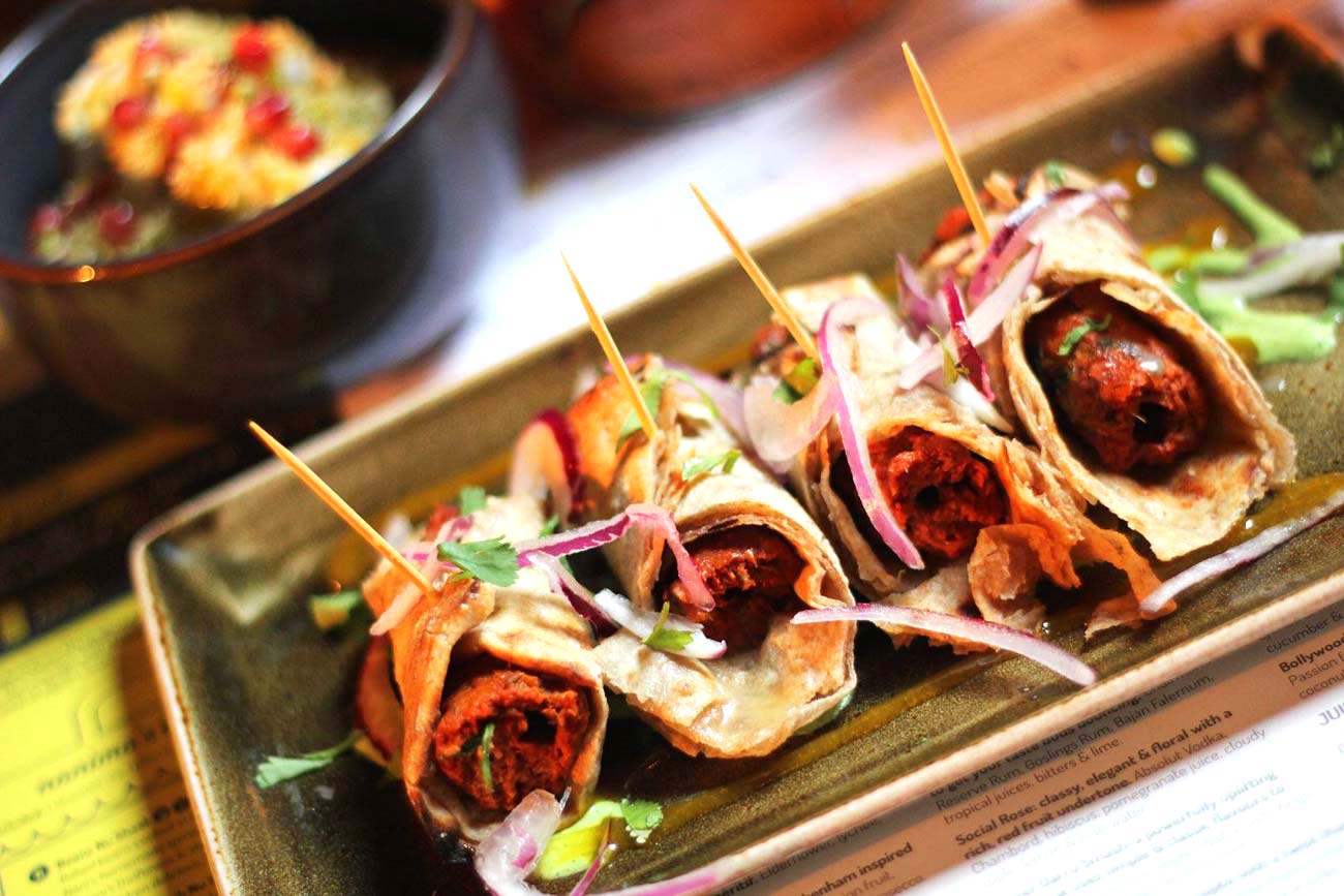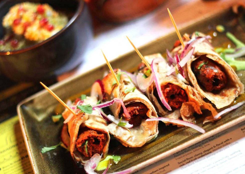 - Khan Chacha’s Seekh Paratha – Lamb seekh kebab served on paratha (flat bread) with mint chutney & pickled red onion (can be served without the paratha for