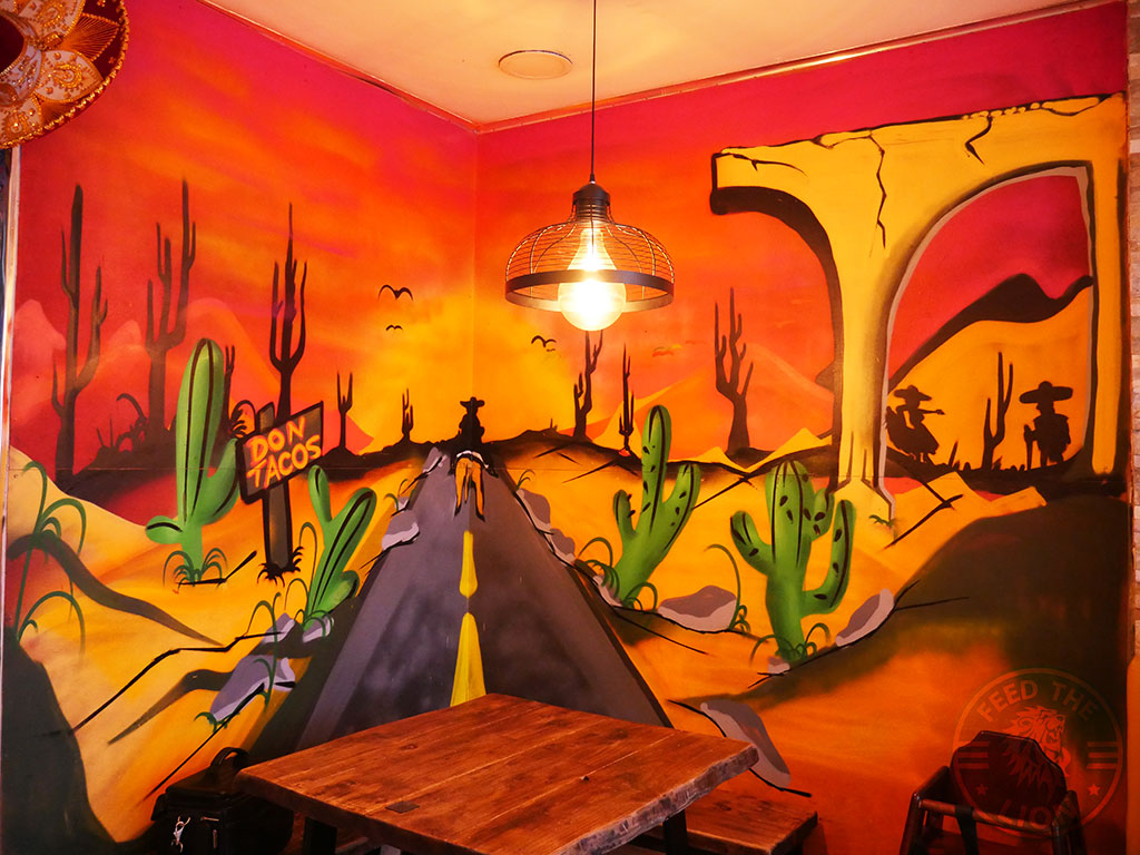 This 24-cover branch looks the part too, with colourful TexMex paraphernalia that includes Mexican hats, a life-size vaquero (that’s a Mexican cowboy to you and us), and an eye-catching wall mural depicting a dusty rural desert town.