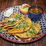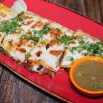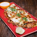 Birria Quessadi – Grilled 10″ tortilla filled with chicken/ beef, layers of cheese, jalapeneos, onions, pico de gallo, refried beans, soured cream, £12.50