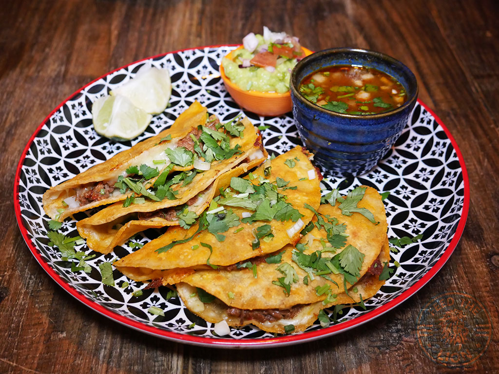 With a meat tortilla entirely coated in two layers of piquant cheese, these are grilled to perfect before being presented with homemade consome and guacamole.