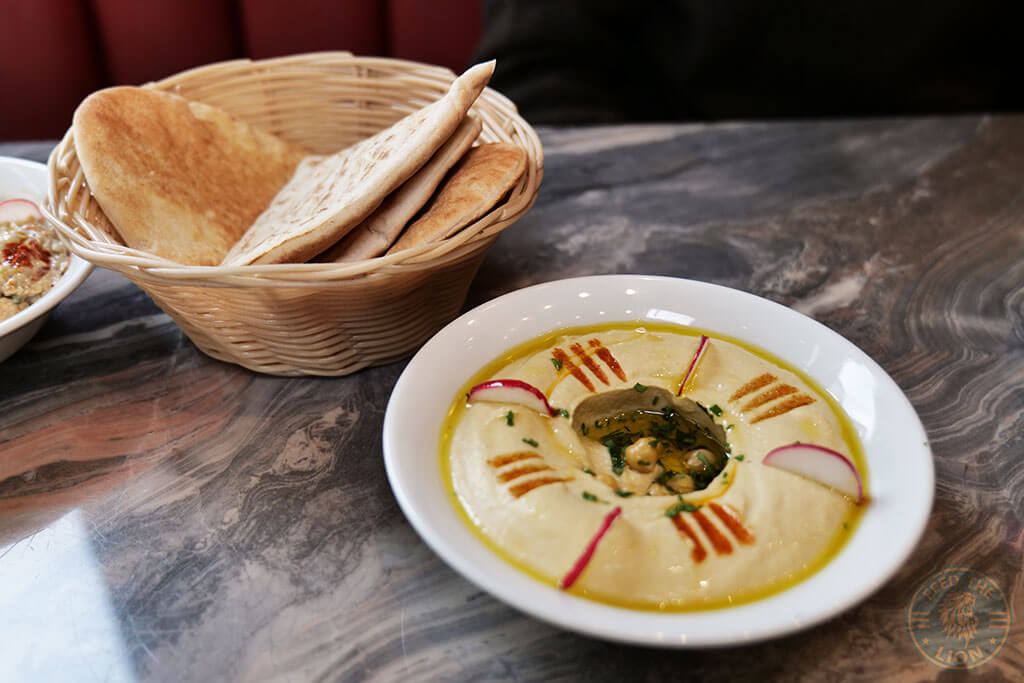 4. Hummus – Cooked chickpeas crushed with tahini, lemon juice, garlic, olive oil, with pita bread, £5.45