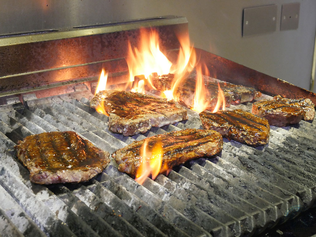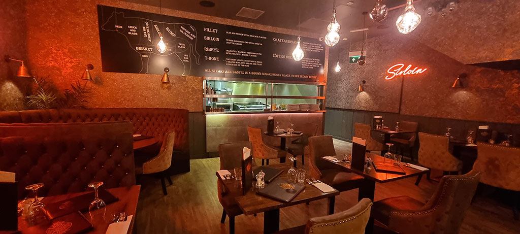 Undoubtedly though, its most striking decorative feature is its wall-mounted, bright red neon signage, which effectively highlights the impressive array of locally-sourced steaks available to order.