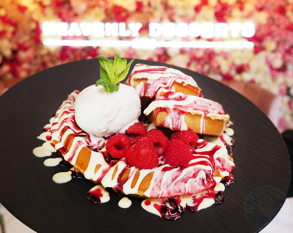 Above is Heavenly Desserts’ famous cross between a waffle & a croissant called a Croffle with real ruby & white chocolate and fresh crimson raspberries