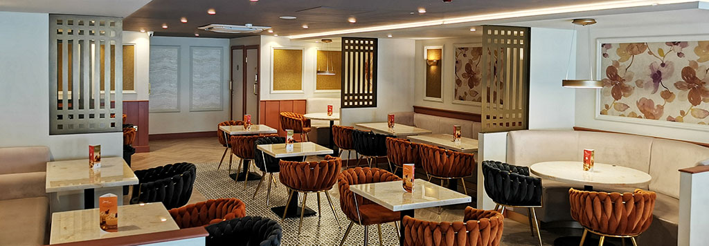 With a spiralling crystal chandelier as the focal point of this restaurant’s striking interior, seating is available for 22 downstairs as well as an additional 48 upstairs where you’ll also find a discreet prayer room.