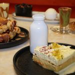 Vanilla, Pistachio & Rose Milk Cake – Light vanilla sponge, soft cream, crushed pistachios, rose, pistachio milk syrup, £6.75