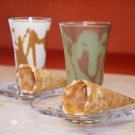 Shots to prime the palate with Milk Chocolate & Pistachio (front) and White Chocolate & Biscoff Shots (back)