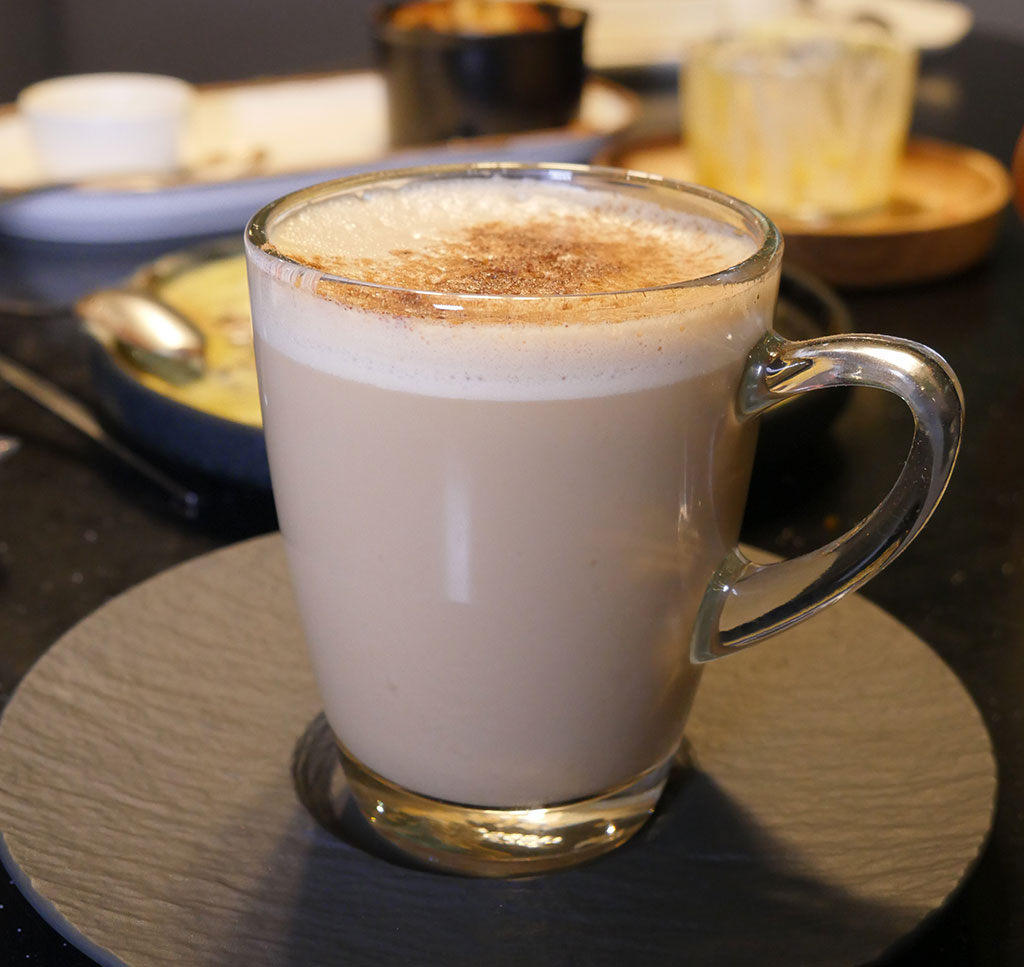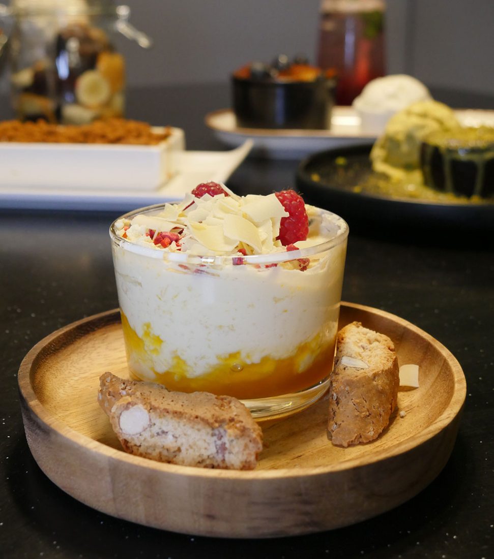 Accompanied by crunchy chunks of almond Biscotti biscuit, this creamy posset was flavour-personified, ranging from the zinginess of the lemon cream, to the soft and chewy crushed meringue therein, and enough white chocolate shards and fresh raspberries on top to satisfy.