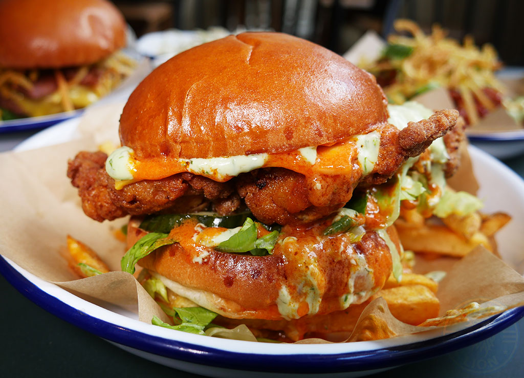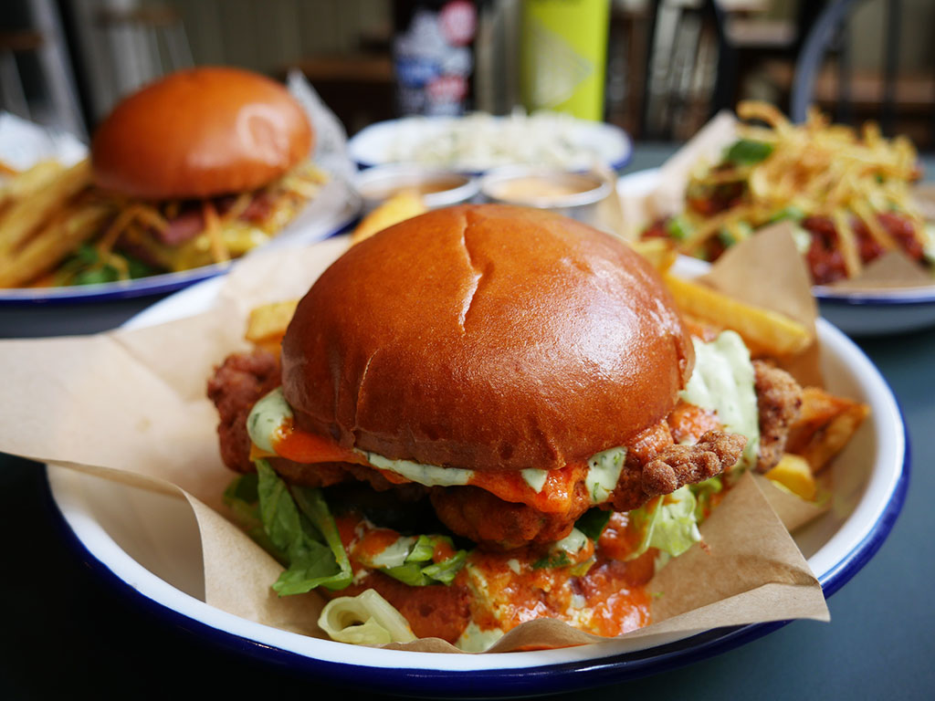 Buffalo – Free-range buttermilk fried chicken thigh, American cheese, Frank’s RedHot buffalo sauce, ranch mayo, lettuce & pickles, £13.50 inc. a side