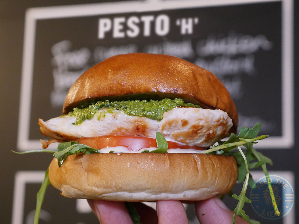 Pesto – Free-range grilled chicken breast, basil pesto, mustard mayo, tomato & rocket, £12.50 inc. a side