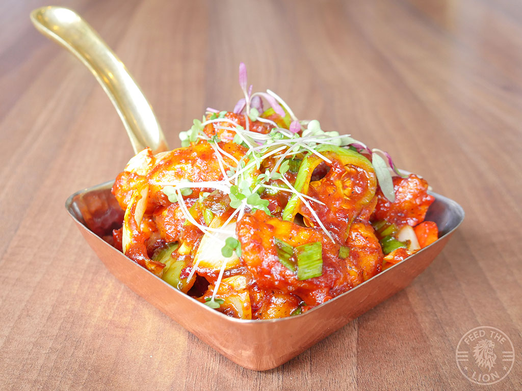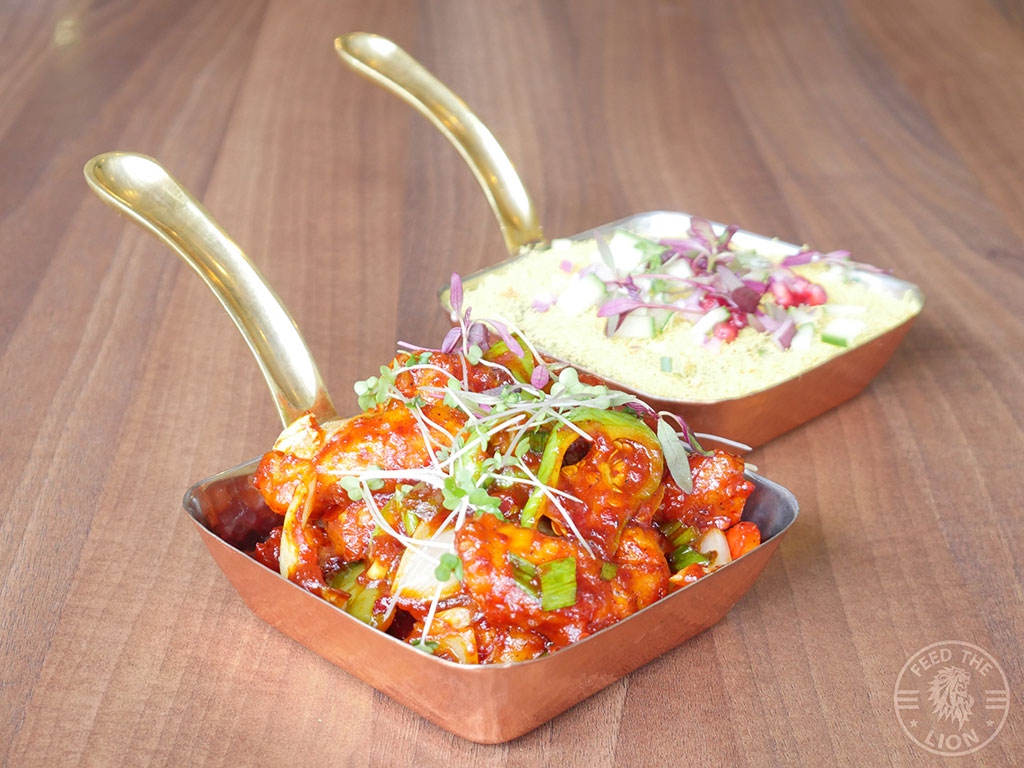 The menu offers a number of items from various regions of India, including a quartet of fish dishes such as the Goan Prawn Masala, as well as a number of Indo-Chinese items like Chicken 65 from the Chef’s Special section.