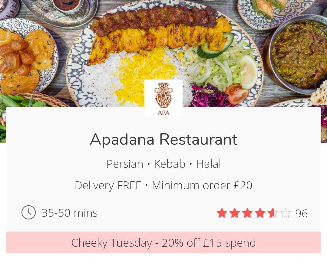 0 Comments 5 Apr '20 nw8-apadana Cheeky Tuesdays get 20% off JustEat London UK Cheeky Tuesdays get 20% off JustEat London UK Share With: