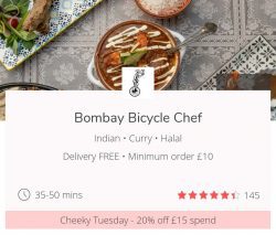 0 Comments 5 Apr '20 nw8-bombay bicycle chef Cheeky Tuesdays get 20% off JustEat London UK Cheeky Tuesdays get 20% off JustEat London UK Share With: