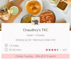 0 Comments 5 Apr '20 ub6-tkc chaudhry’s southall Cheeky Tuesdays get 20% off JustEat London UK ub6-tkc chaudhry’s southall Cheeky Tuesdays get 20% off JustEat London UK Share With:
