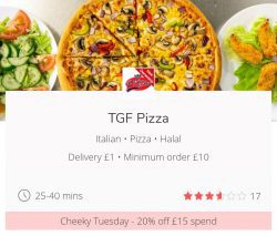 0 Comments 13 Apr '20 TGF Pizza Cheeky Tuesdays get 20% off JustEat London UK TGF Pizza Cheeky Tuesdays get 20% off JustEat London UK Share With: