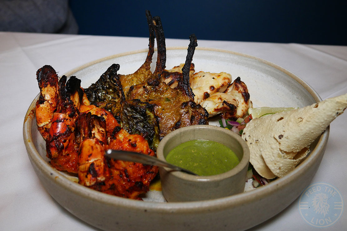 This busy-looking surf ‘n’ turf Masala Mixed Grill starter comprised of attractive looking proteins, served with an unbelievably fresh and vibrant mint sauce, and a large spoonful of finely diced tasty salad that was topped with a not-so crispy papadum cone.