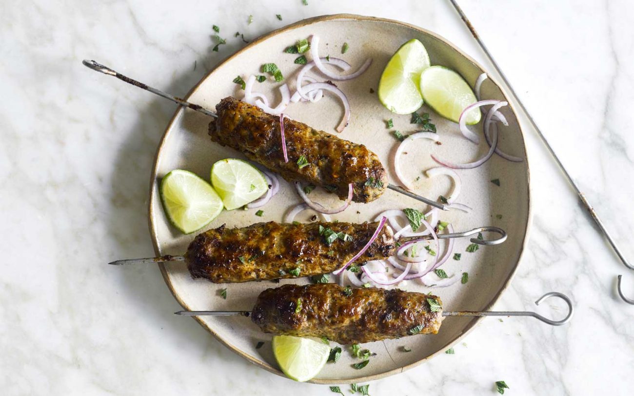 - Heat the grill to medium-high. Grill the kababs for 4–6 minutes, turning regularly, until nicely browned and cooked through, but still soft and tender inside. Let the kababs rest for 2 minutes, then transfer them to plates and garnish with chopped mint and red onion. Serve at once, with lime wedges.