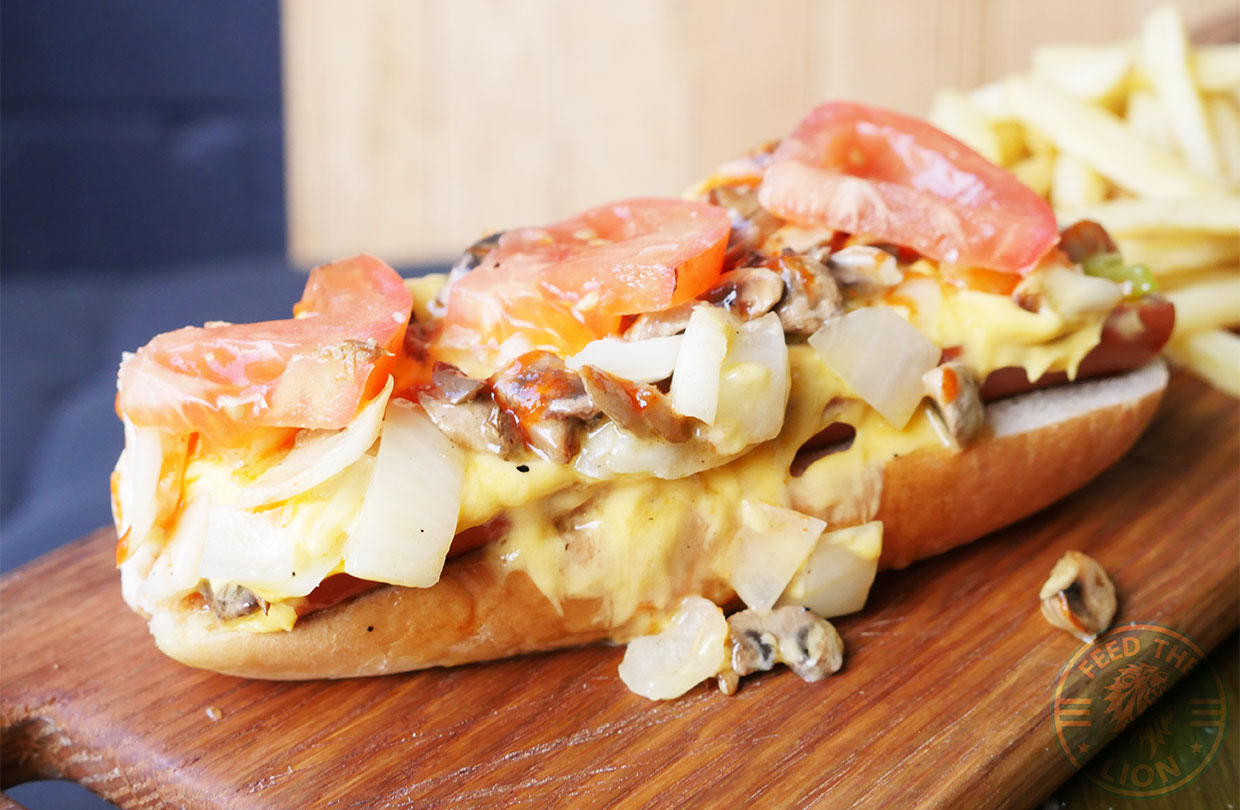 This hot dog contains premium turkey sausage that’s absolutely smothered in smoky grilled onions and mushrooms, ketchup, pickles, tomatoes, spicy mustard, as well as housemade runaway cheese sauce, a tash-tash sauce, before being sprinkled in crispy dry onions to provide that textural contrast.