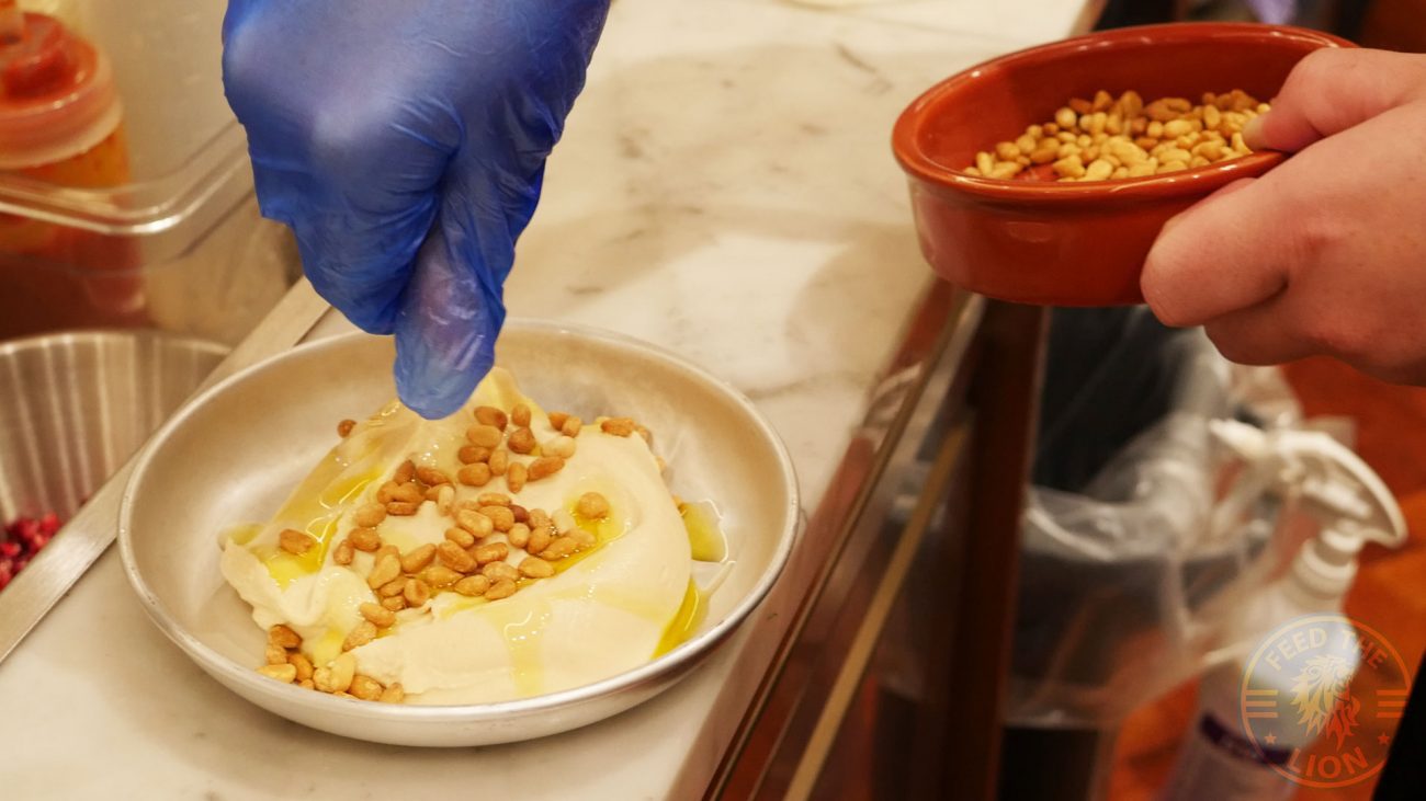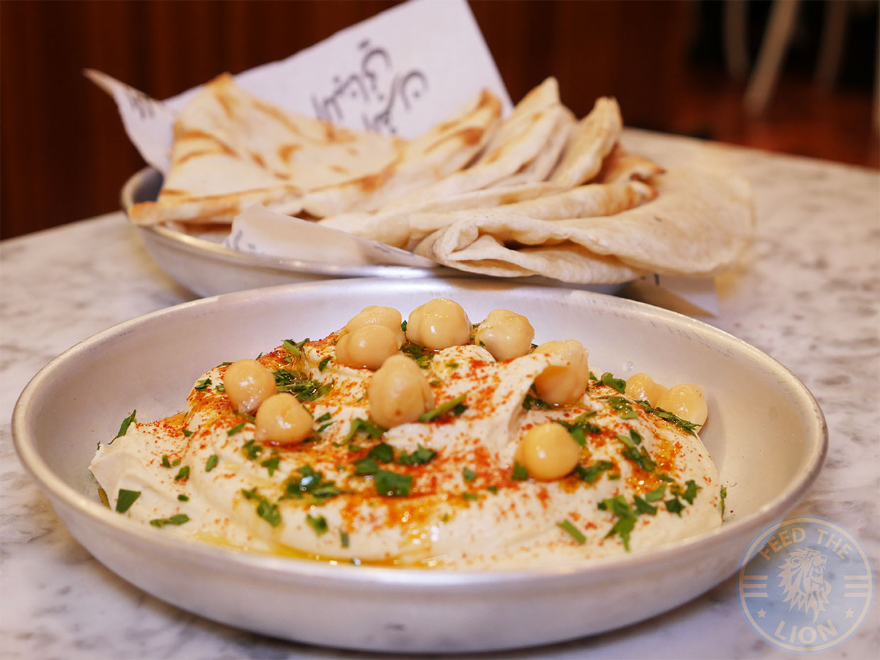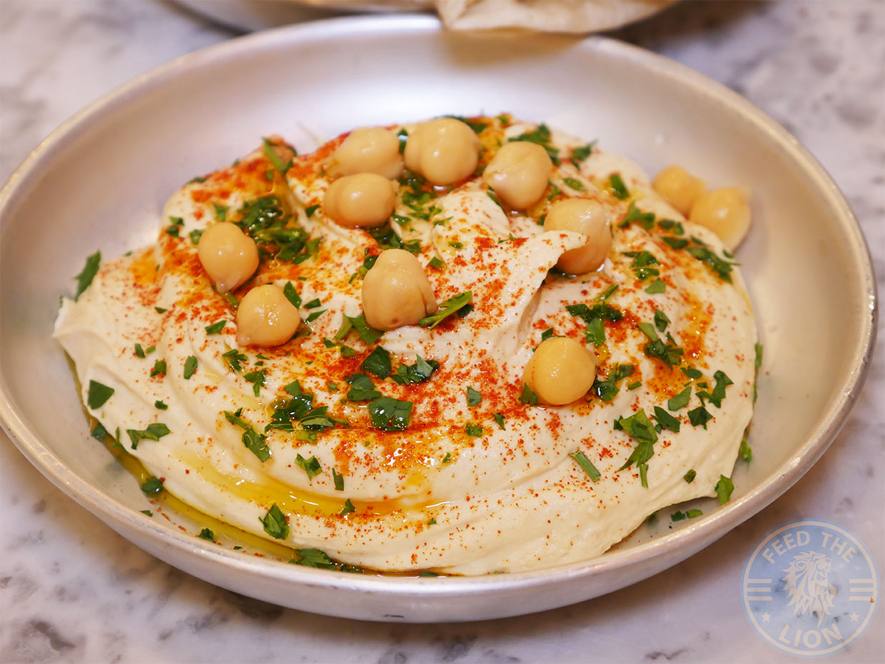 Hummus (standard) – Chickpea purée, tahini, lemon, olive oil, £9.75; with Pine nuts £10.50; Awarma £12.50;