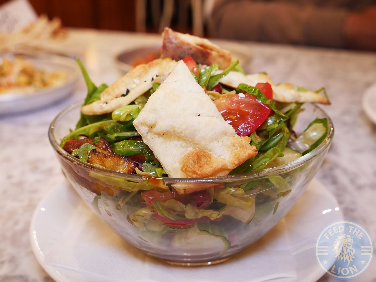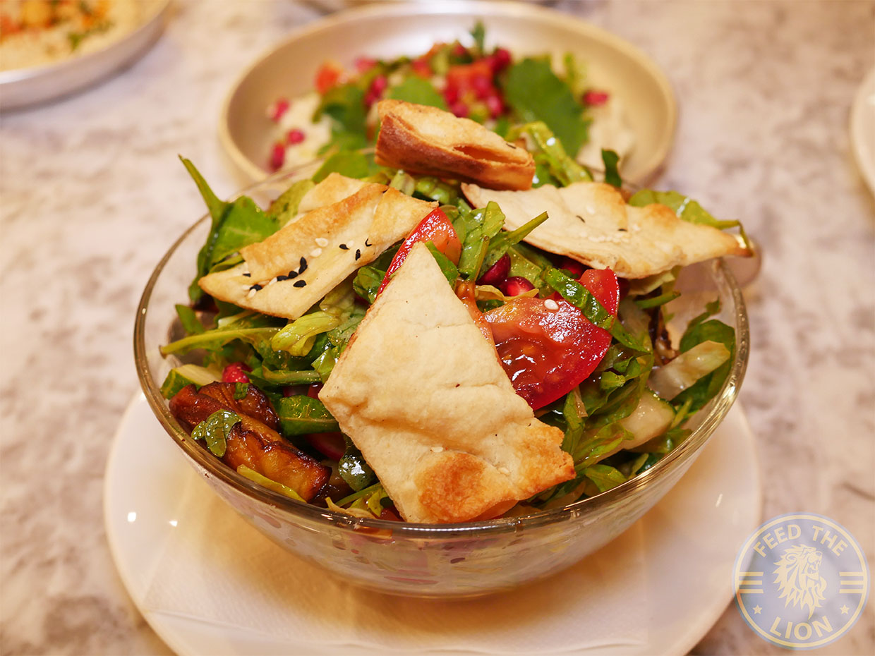 Fattoush Aubergine – Mint, rocca, lettuce, tomato, cucumber, radish, roasted aubergine, kaakeh crisps, pomegranate vinaigrette, £9.75