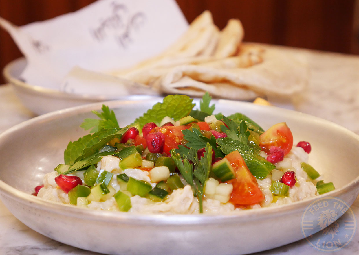 Baba Ghanouj – Charred aubergine, tahini, pomegranate, cucumber, cherry tomato, green pepper, parsley, mint, £9.75