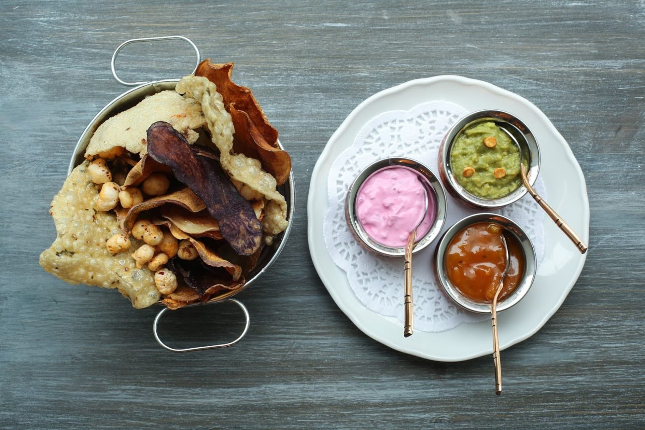 A range of vegan Ayurvedic shots and smoothies are on offer as palate cleansers before the meal, incorporating ingredients that have been part of Indian health and well-being regimes for centuries. Ashwagandha Indian herbal tea; Aloo Bhukhara smoothie (Indian rehydrated plums, hemp seed milk and blue poppy seeds); Ved (triphala, ginger and kokum) and Vegan green smoothie (cashew nut milk, bananas, mint, celery and nutmeg) all make up a concise menu of refreshing beverages that are the perfect start to a meal.