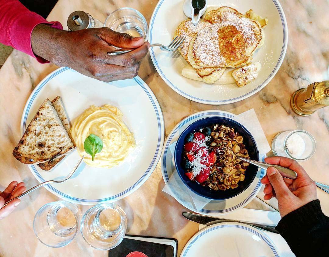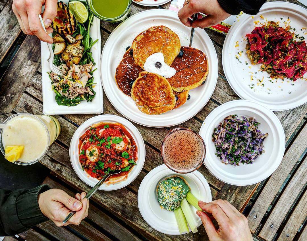 Superfood cocktails including a cold-pressed beetroot mojito and raw coconut matcha colada complement dishes such as gluten-free rhubarb pomegranate oat pancakes with coconut yoghurt and maple vegan butter, or poached eggs and beetroot smoked salmon with cauliflower hotcake and charred kale.