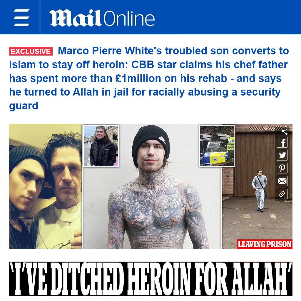 The British tabloid has revealed that Marco Pierre White Jr gave his Shahadah – the verbal declaration of Islamic faith – while serving a year-long prison sentence.