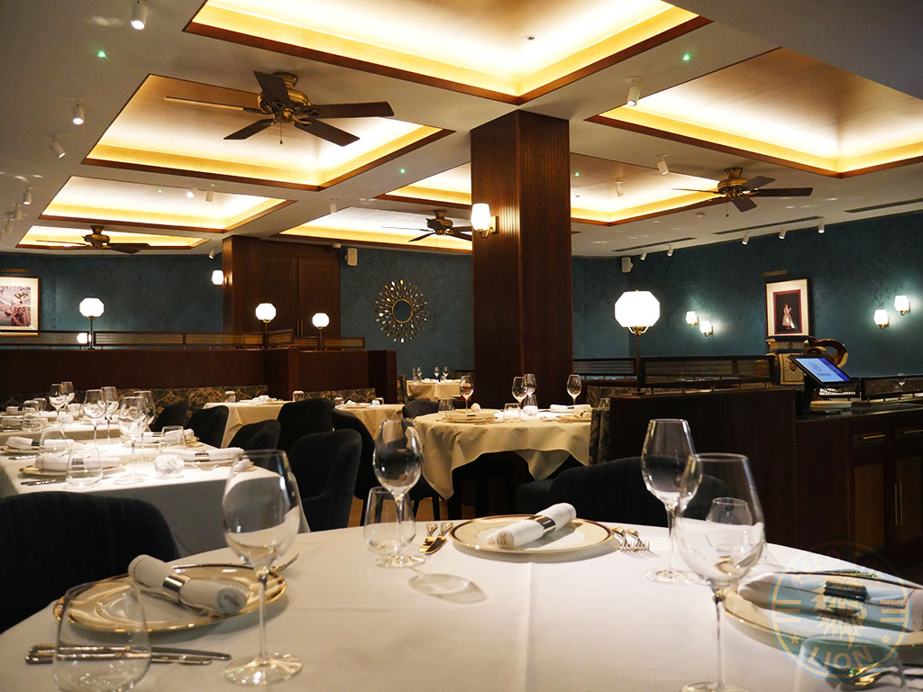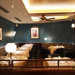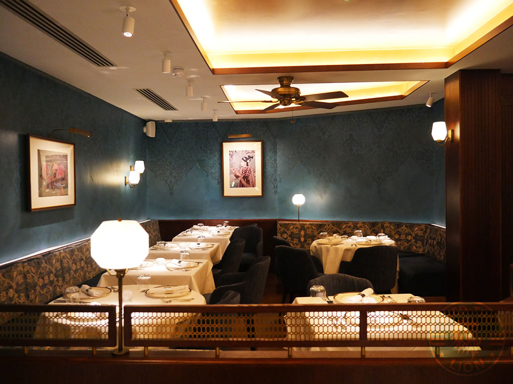 This particular dining space situated downstairs is elegantly decorated, with a turquoise colour scheme, period-style ceiling fans, and cosy compartmentalised seating areas that includes a raised platform towards the back.