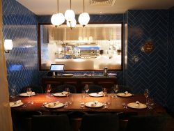 With views to an open kitchen, the Chef’s table is a large, one piece wooden item, which can comfortably accommodate upto eight guests, and comes complete with a formal tasting menu.