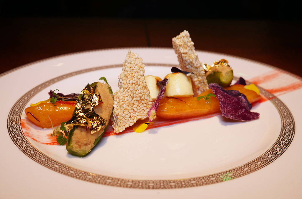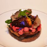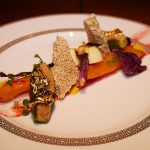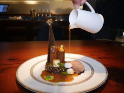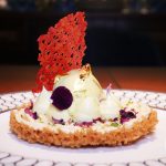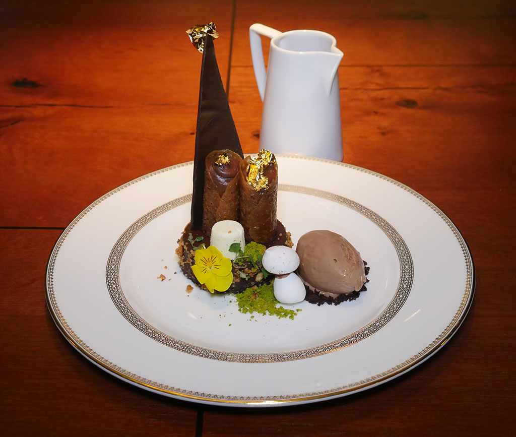 And while a rocher of ice cream on a soil bed accounted for more chocolate elements, including a tall shard with gold leaf for a flag, there was also thimble shaped baked cream, as well as some pistachio soil to boot.