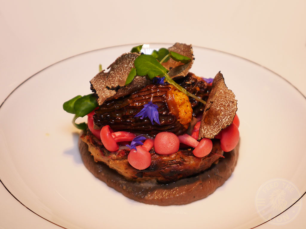 While the morels stuffed with paneer cream worked in tandem with both the dark and creamy-smooth puree, as well as what appeared to be pickled enoki mushrooms, to deliver the earthy with the nutty and mellow sweet, a positively saturated, soft and tender portobello mushroom helped cut through the richness. Stunning!