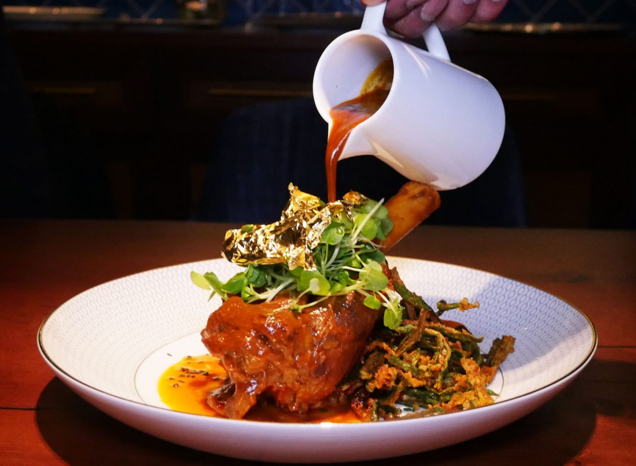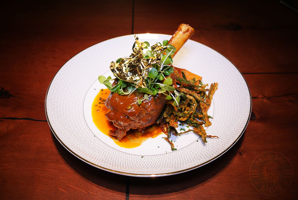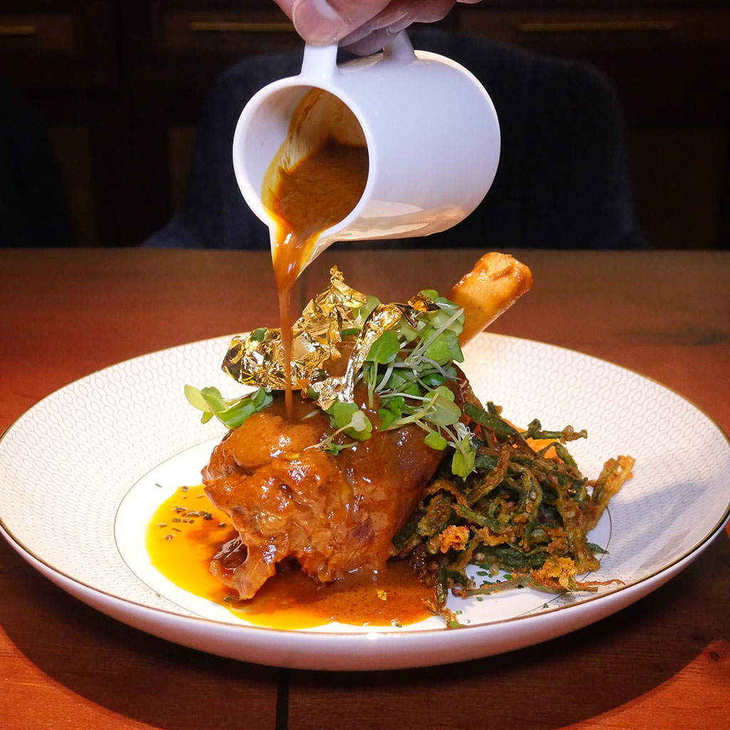 Nalli Kosha – West Country lamb shank simmered in hot spices, mustard and yoghurt, gold, sweet potato, £39