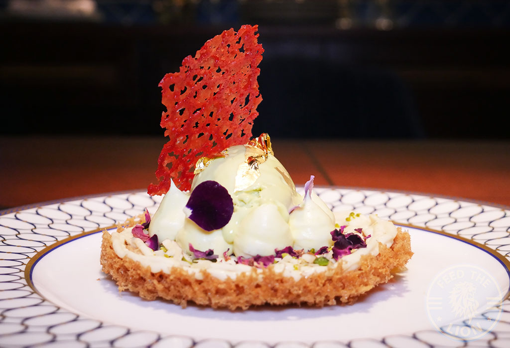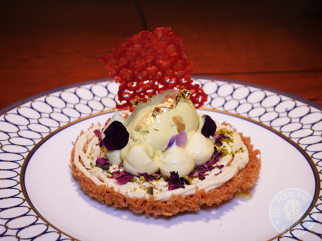 What was even better was the way in which the smooth scoop of pistachio ice cream, encircled by relatively firmer globules of lime flavoured curd, combined with this plate’s essential element – a delicate and uber crunchy disc of lightly sweetened batter.
