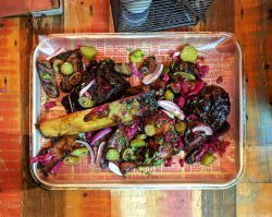 Smokestack Platter (sharing for 2 or 3) – Smoked Brisket, ribs, half chicken & hotlinks. Served with slaw, pickles, 2 portion fries & BBQ pit beans, £34.50