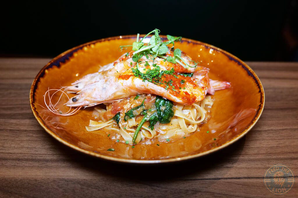 Grilled Asian Prawn Fettuccine Spaghetti, Chilli Garlic, Olive Oil, Tomato Sauce £34.95