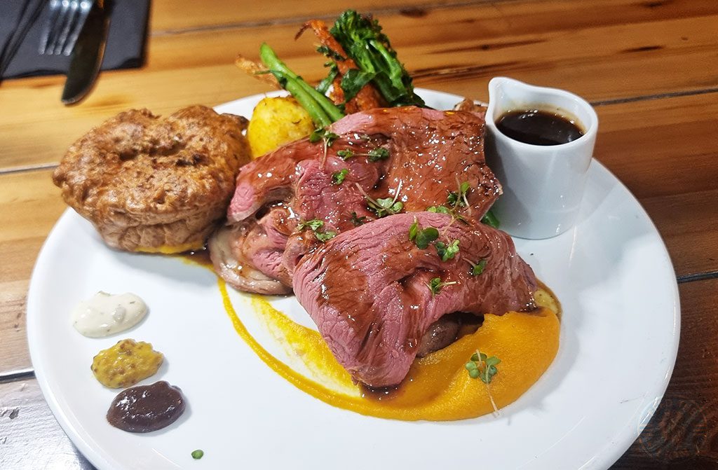 Sirloin Roast – Neep cream, potatoes, spiced veggies, gravy, Yorkshire pudding, trio of relish, £24.00